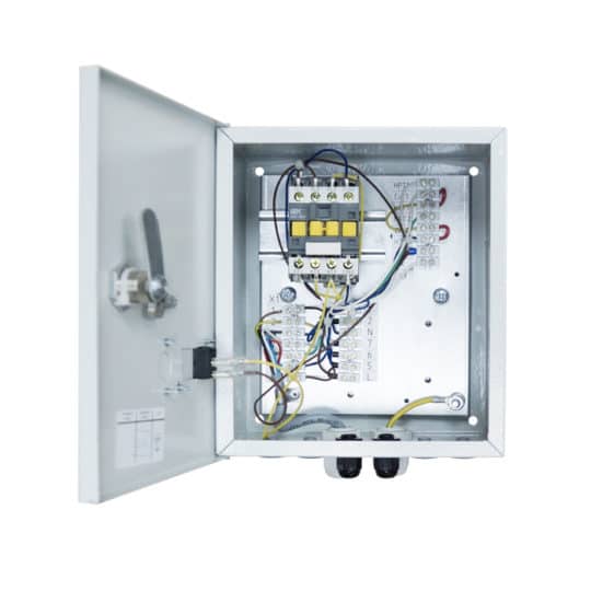 Блок E предназначен для подключения концевого выключателя (арт. 500195) и внешних термостатов Т1 т Т2 к завесам с электрическим источником тепла.