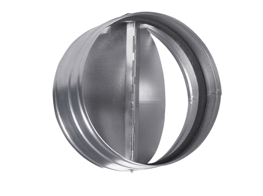 Обратный клапан с подпружиненными лопастями предназначен для автоматического перекрывания круглых воздуховодов при отключении систем вентиляции. Корпус клапана выполнен из оцинкованной стали, лопасти из листового алюминия. Крепление клапана к другим элементам системы вентиляции производится при помощи ниппельного соединения. Клапан может быть установлен в вертикальном положении.
