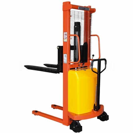 Электроштабелеры с электроподъемом (на аккумуляторных батареях) предназначены для работы в довольно интенсивном режиме. Эти штабелеры зарекомендовали себя как очень надежные, высококачественные и неприхотливые в использовании. Подъем и опускание вил производится электродвигателем, а перемещение вручную. Используются при необходимости быстрого подъема на высоту. Рычаг подъема находится на корпусе штабелера. Колеса снабжены тормозными механизмами.