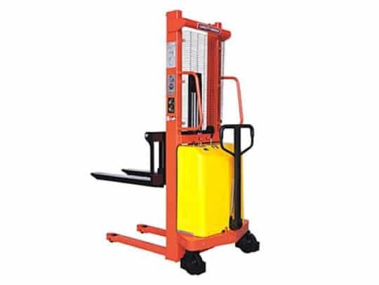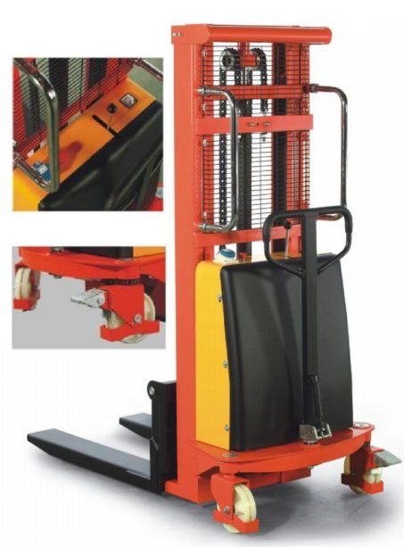 Электроштабелеры с электроподъемом (на аккумуляторных батареях) предназначены для работы в довольно интенсивном режиме. Эти штабелеры зарекомендовали себя как очень надежные, высококачественные и неприхотливые в использовании. Подъем и опускание вил производится электродвигателем, а перемещение вручную. Используются при необходимости быстрого подъема на высоту. Рычаг подъема находится на корпусе штабелера. Колеса снабжены тормозными механизмами.