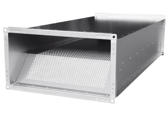 Трубчатый глушитель прямоугольного сечения – конструкция, состоящая из трубы прямоугольного сечения и блока. Блок наполнен звукопоглощающим материалом (толщина слоя до 200мм), занимает около половины внутреннего пространства. из них имеет меньший размер и вставляется в параллелепипед большего размера. Внутренний блок имеет перфорацию.