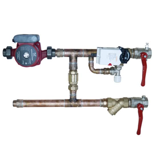 Смесительный узел УТ-КЭВ-21H с насосом, применяется при разности давлений между прямой и обратной магистралью в месте установки завес: ΔP < 40 кПа.