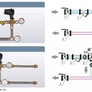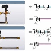 Узлы регулирования воздухоохладителей должны обеспечивать переменный расход холодоносителя на воздухоохладителе, в то же время количество холодоносителя, протекающего через узел должно оставаться неизменным, т.к. холодильные машины (чиллеры), подающие к ним охлажденную жидкость критичны к постоянству протекающей через них жидкости. Эти два требования определяют схемное решение для узлов регулирования воздухоохладителей.
