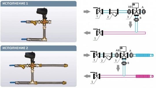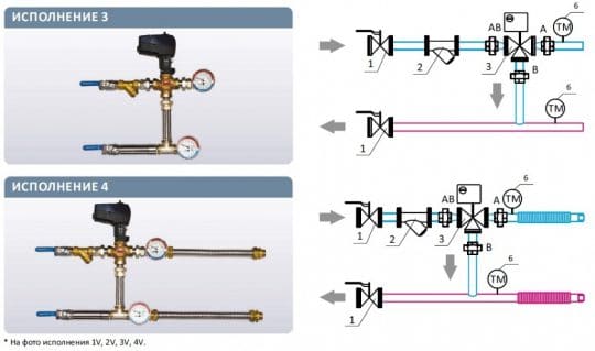 Когда клапан полностью открыт, жидкость движется по направлению АВ-А и в этом случае весь теплоноситель попадает на воздухоохладитель вентустановки. Холодильная мощность узла при этом максимальная. В полностью закрытом состоянии жидкость движется по направлению АВ-В и в этом случае весь холодоноситель перепускается обратно в сеть, не проходя через теплообменник. Холодильная мощностьузла при этом минимальна. Во всех промежуточных положениях часть теплоносителя подается на теплообменник, а часть перепускается в сеть. Расход теплоносителя через узел во всех положениях регулирующего клапана одинаков.
