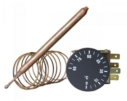 Корпус терморегулятора изготовлен из металла и оборудован ручкой регулирования температуры. Корпус соединен с измерительной колбой капиллярной трубкой длиной 1 м. Температура отслеживается при помощи измерительной колбы, которая устанавливается непосредственно в теплообменный кожух камина. Термостат включает или выключает каминный вентилятор в зависимости от повышения или понижения температуры воздуха. При превышении установленной температуры – вентилятор включается, а когда температура снижается – вентилятор выключается.